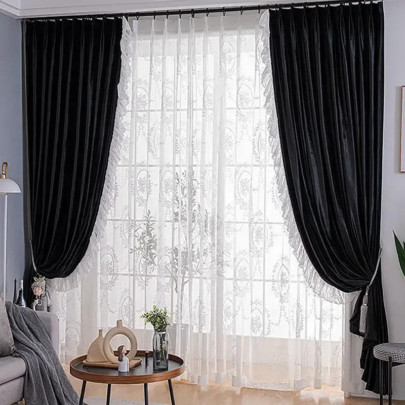 Trimmed black curtains offer a classic, bold, and timeless aesthetic, making them a striking choice for any living room. Their deep, rich color not only adds sophistication but also serves practical purposes. Black curtains can effectively block out excess light, making them ideal for rooms with high sunlight exposure, and they help trap heat during colder months, enhancing energy efficiency. However, there’s a risk of creating a space that feels too dark or gothic if not balanced properly. To counteract this, opt for a design that incorporates a lighter trim. Adding a few inches of cream or off-white fabric at the bottom can provide a refined contrast, softening the overall look and ensuring that the curtains complement your living room’s décor without overwhelming it.