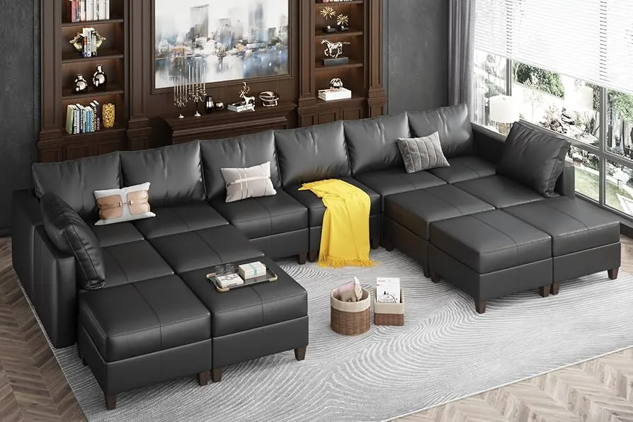 Compact double-chaise sectional features flexible seating and hidden storage ottomans. It is known ideally for daily use and entertainment due to its customized modular design layout. This sectional also optionally includes backrests and armrests. As the best U-shaped sectional couch, it is a space-saving and versatile option that offers comfort, practicality, style, and modernity.