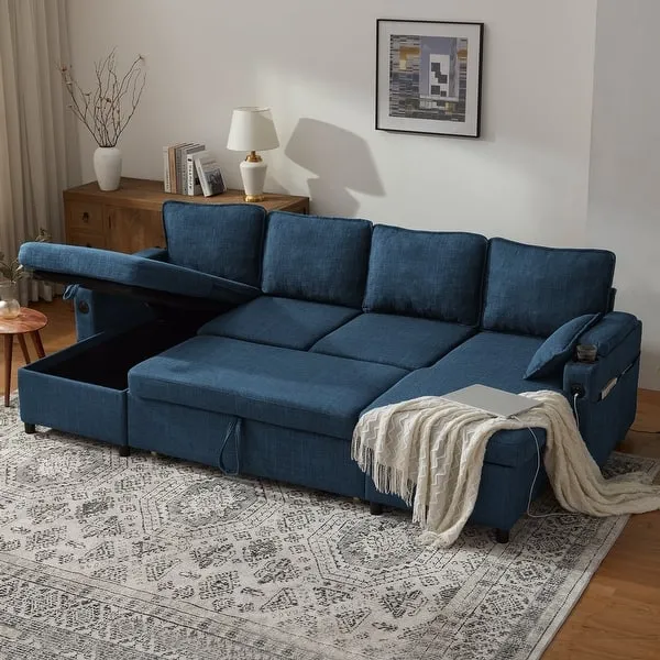 A versatile leg option with a chic sectional adds modern, traditional, or coastal flair. It is praised for value, customization, and comfort. A small U-shaped sectional offers a storage chaise, luxury, and a pull-out sleeper, ideal for a compact living space for maximizing seating arrangement.