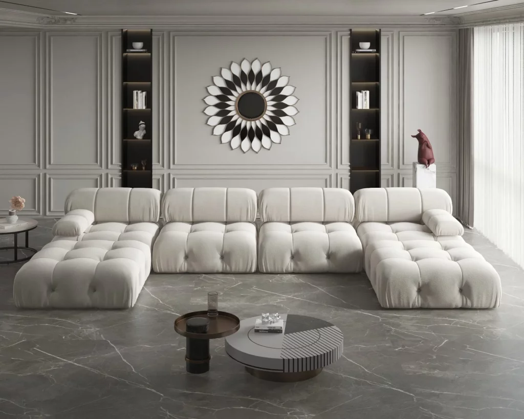 Chaise Sectional combines comfort and durability with ultra-soft cushions and boucle fabric. It is easy to maintain in terms of shape, sturdiness, and cleanliness. Setting it up is simple and is ideal for lounging, featuring seating for 3–4 adults. For people who require more space, this large U-shaped sectional is ideal for accommodating family movie nights or bigger gatherings.