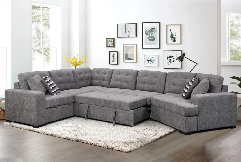 The Tuxedo Sleeper Sectional blends functionality and style, turning into a cozy bed in just 2 minutes. Even though cushions may get soft over time, they withstand pets and kids due to their durability. As the best U-shaped sectional couch for families looking for utility and comfort besides style and functionality.