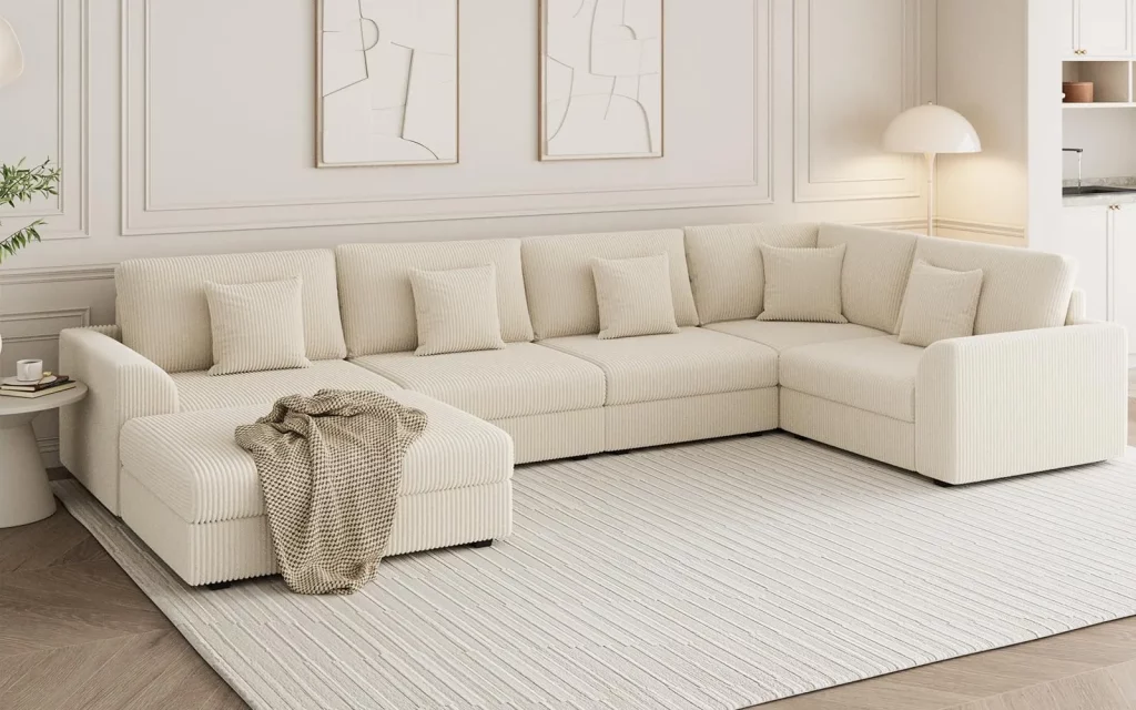 The XXL corduroy sectional sofa is spacious, another option to consider if you are searching for the best U-shaped sectional couch. It is best suited for large family gatherings, seating up to 8 people. Reviewers have liked this sofa because of its value, size, and luxurious appearance. Thus, it is an ideal choice for entertainment-focused or open-concept homes.