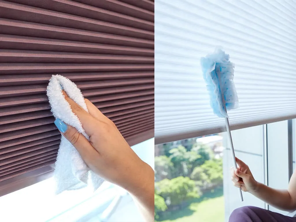 - Use a feather duster or microfiber cloth to frequently dust wood blinds to avoid accumulation.
